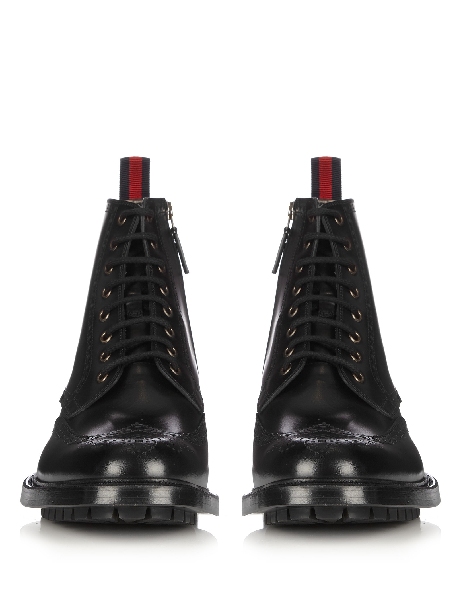 Gucci's black smooth-leather boots echo the heavy-duty feel of Teddy Boy footwear. They're trimmed with traditional wing-tip oxford brogue detailing, and shaped to a rounded silhouette that's finished with a signature Web tab and a tiger head plaque at the heel. Fits true to size.