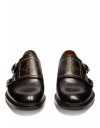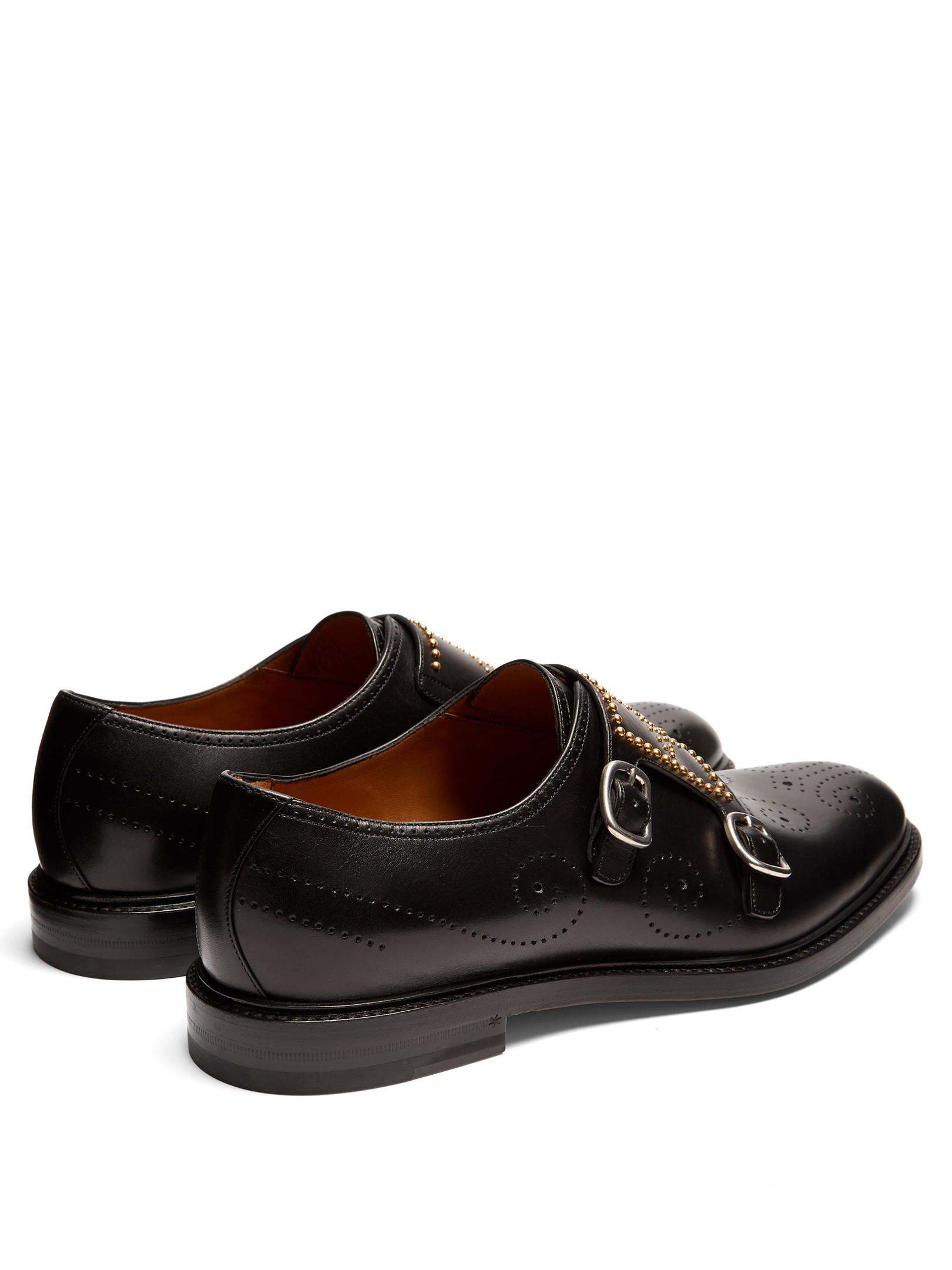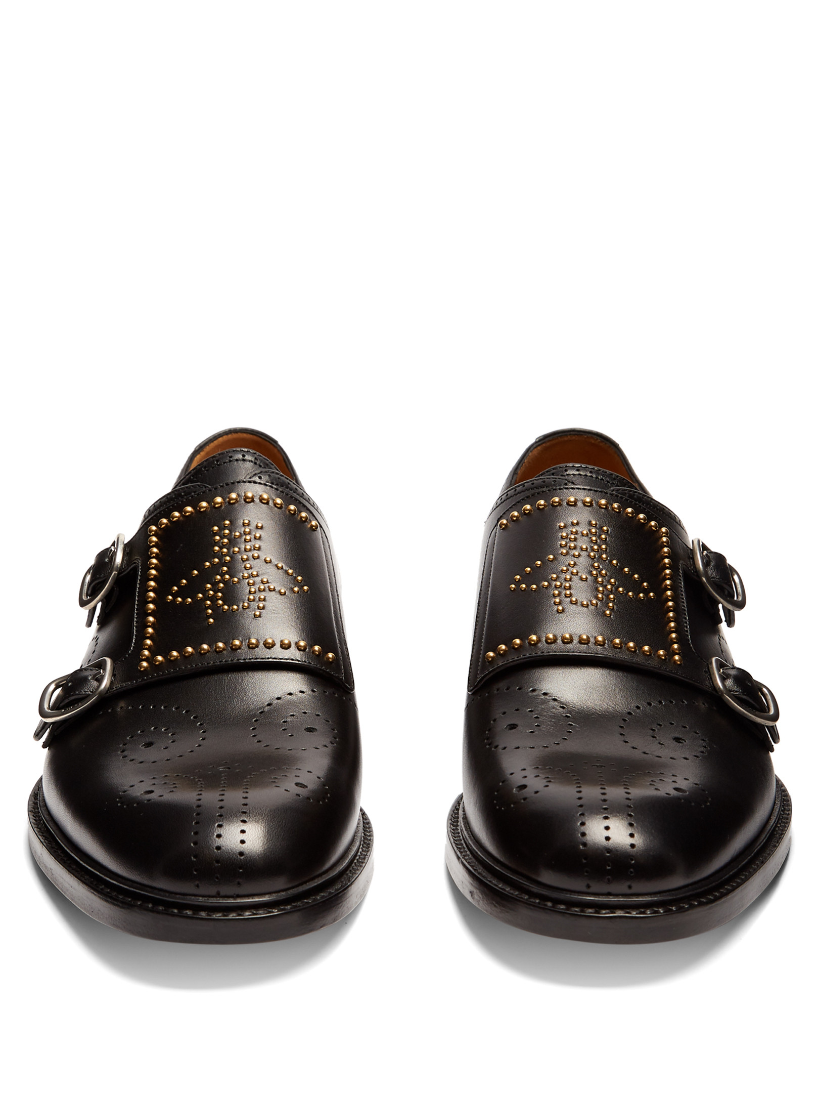 Gucci's whimsical details disturb the classic feel of these smooth black leather Cirano brogues. They have a slick almond-toe shape, and are enlivened with swirling perforations and a signature bee motif across the monk straps formed from tiny gold-tone metal studs. Fits true to size.