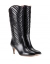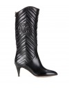 80s-Flair geht Hand in Hand mit diesen kniehohen Stiefeln von Gucci. Ganz in labeltypischer Manier ist das aus schwarzem Matelassé-Leder gefertigte Modell mit dem doppelten G am Schaft und einem goldfarbenen Tigerkopf an der Rückseite versehen. Eine spitze Kappe und ein Kittenheel runden das Design stilgerecht ab.