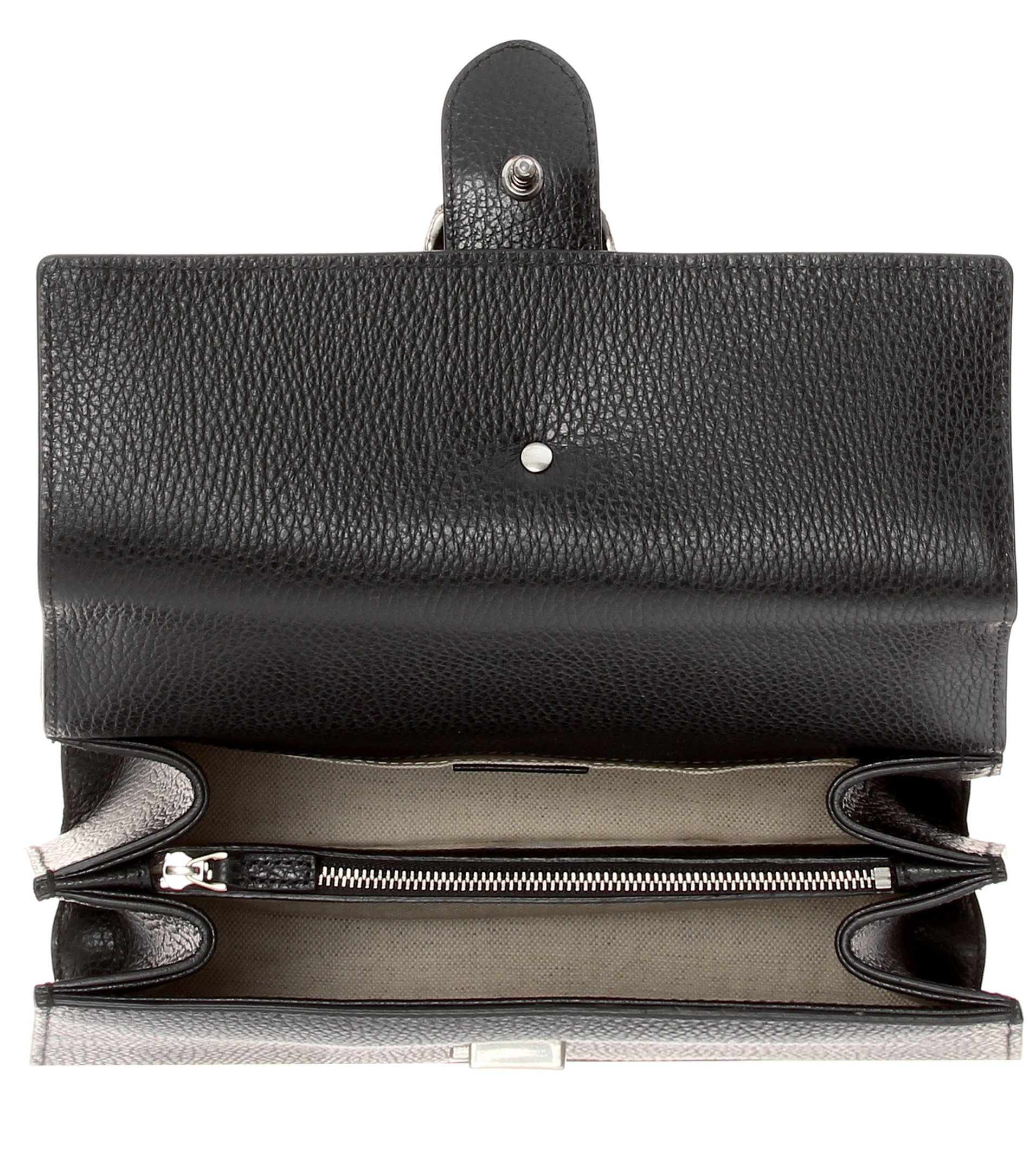 Die Dionysus Bamboo Schultertasche von Gucci punktet mit ihrem geradlinigen Format. Das schwarze Modell ist in Italien aus strukturiertem Kalbsleder gearbeitet und mit einem charakteristischen Henkel aus Bambusholz versehen. Der ikonische Tigerkopf-Verschluss in Antiksilber ist mit glänzenden Kristallen besetzt und bildet das glamouröse Finish des mittelgroßen Accessoires.