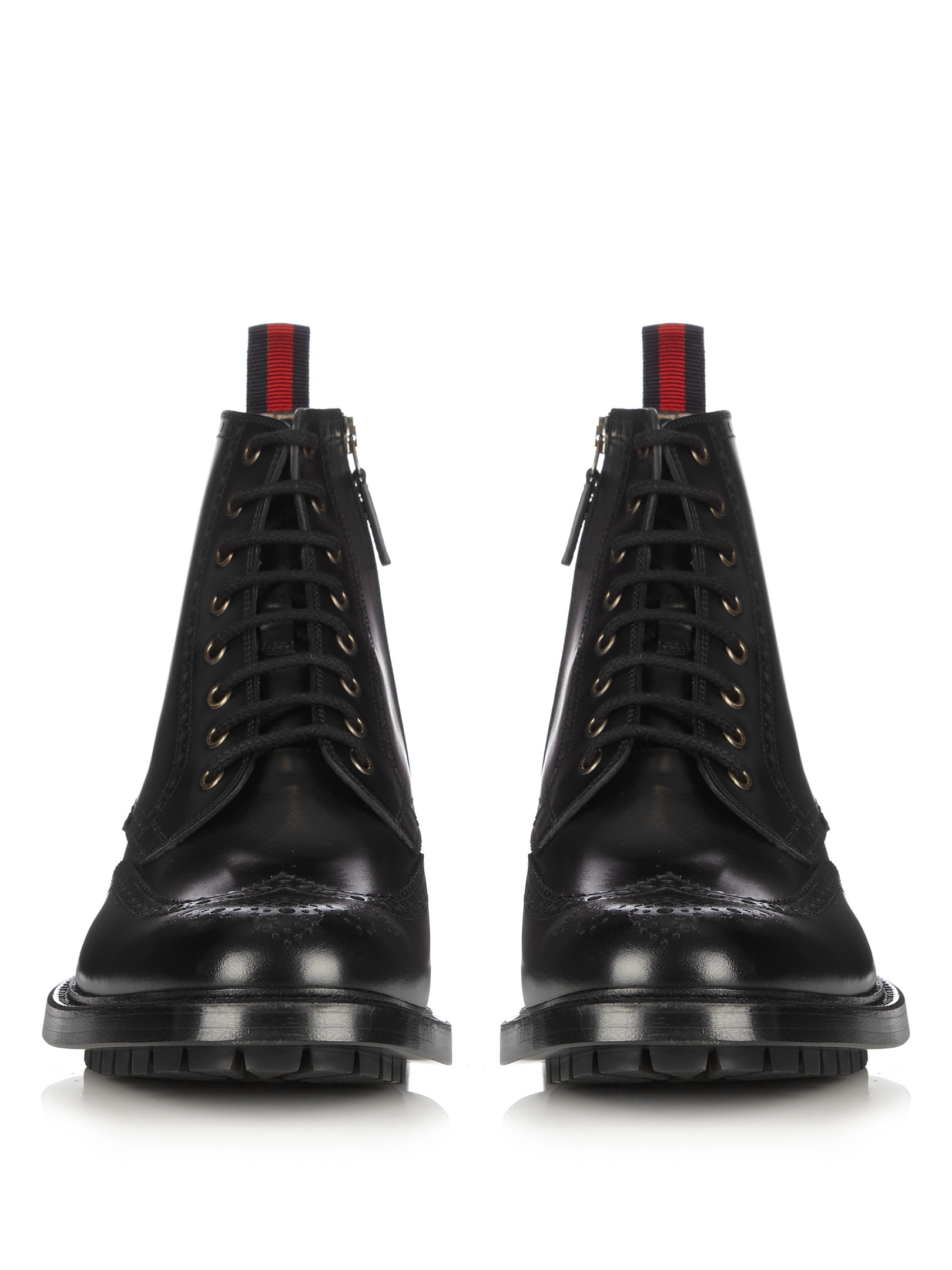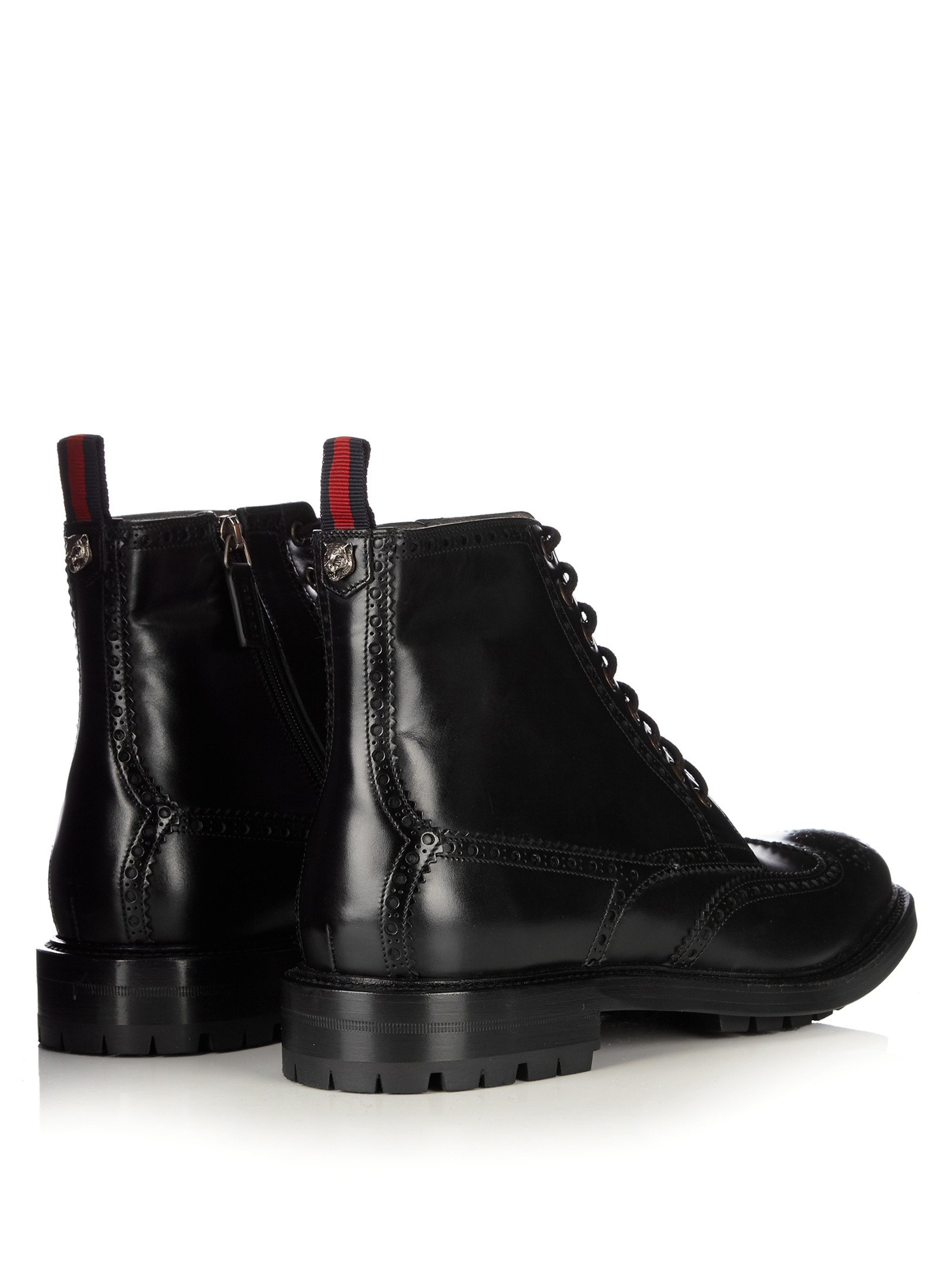 Gucci's black smooth-leather boots echo the heavy-duty feel of Teddy Boy footwear. They're trimmed with traditional wing-tip oxford brogue detailing, and shaped to a rounded silhouette that's finished with a signature Web tab and a tiger head plaque at the heel. Fits true to size.