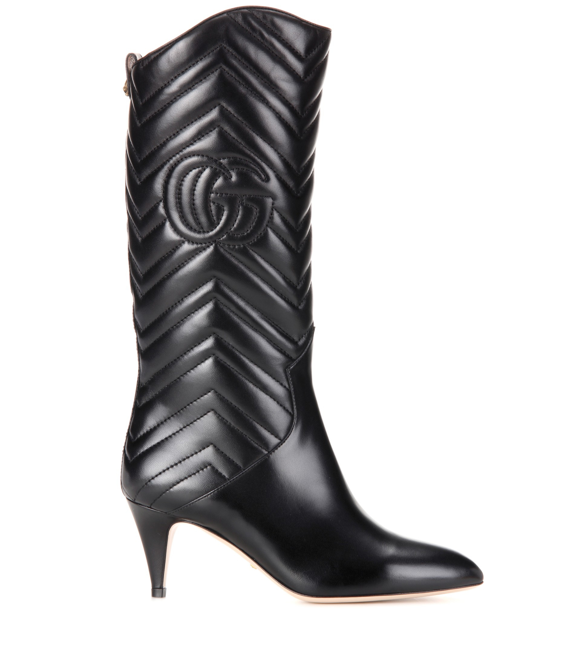 80s-Flair geht Hand in Hand mit diesen kniehohen Stiefeln von Gucci. Ganz in labeltypischer Manier ist das aus schwarzem Matelassé-Leder gefertigte Modell mit dem doppelten G am Schaft und einem goldfarbenen Tigerkopf an der Rückseite versehen. Eine spitze Kappe und ein Kittenheel runden das Design stilgerecht ab.