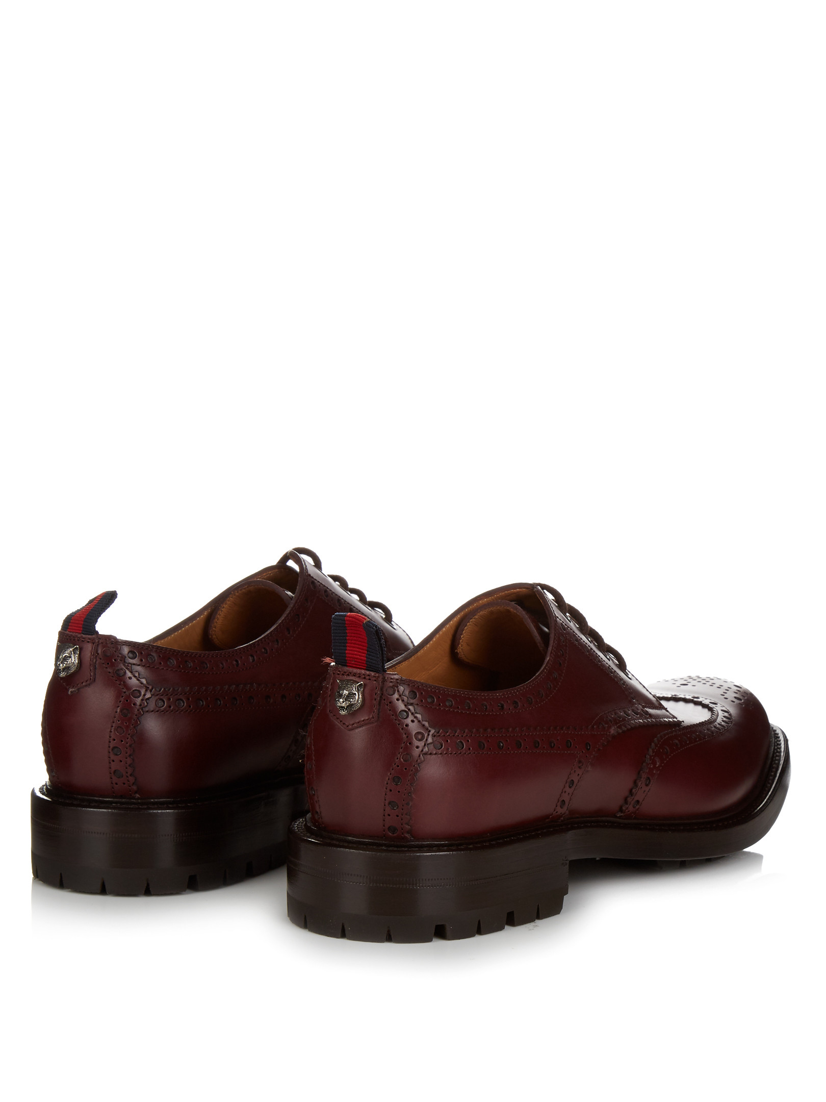 It's the chunky black rubber tread sole that gives Gucci's burgundy Darko brogues the look of styles from 1960s counterculture. They're crafted from smooth leather with classic wingtip oxford brogue detailing, and finished with a signature Web pull tab and silver-tone tiger head at the heel. Fits true to size.